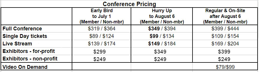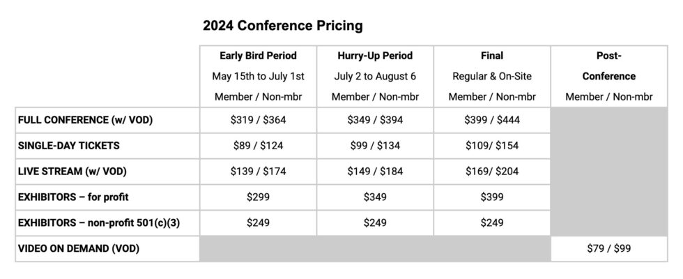 Students receive 60% off Conference Registration. — for students currently enrolled in college, graduate school, community college, high school, etc. You will need to upload your Student ID showing you are an active student: e.g., a student ID or letter from the institution confirming your status.