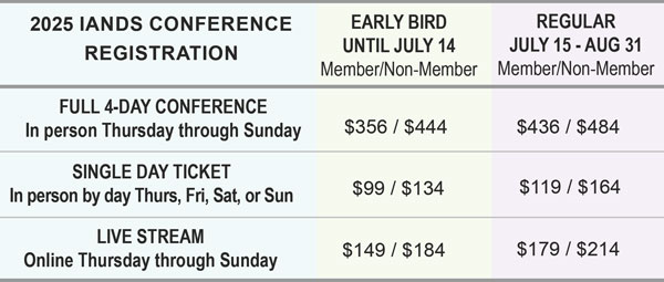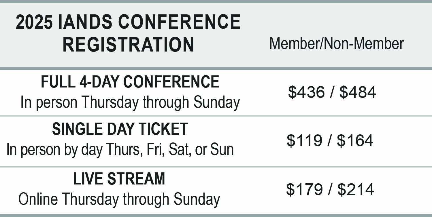 Please note the IANDS Annual Conference includes three concurrent session tracks during most time blocks. Individual session attendance for specific presentations may vary depending on scheduling and attendee interest.